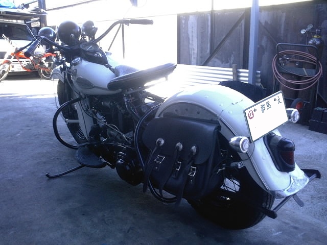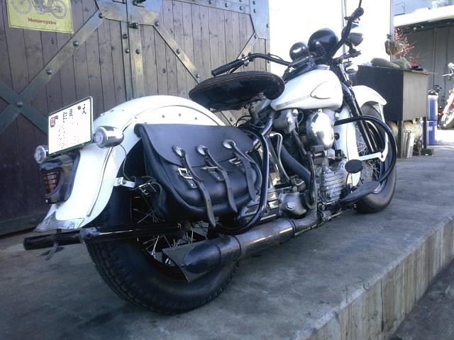 V-TWIN製サドルバッグ。 いい風合いが出てきてこのナックルに似合っています。 |