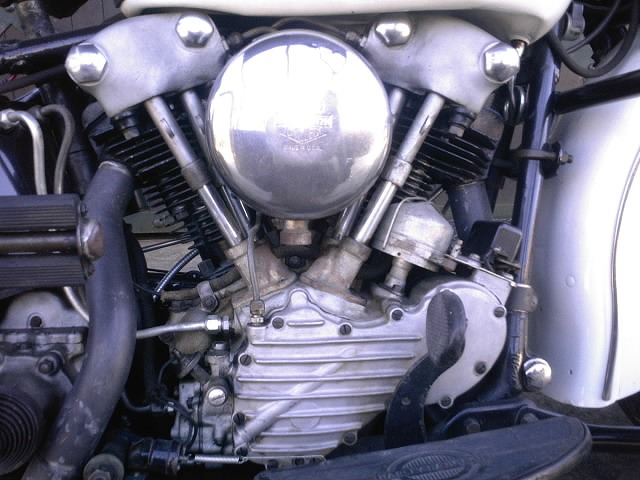 1942年式の61cu.in.(約1000cc)E ナックルヘッドモーター。 圧縮比は6.5:1。 1941年よりカムカバーに装飾的な意味のフィンが付いています。 |