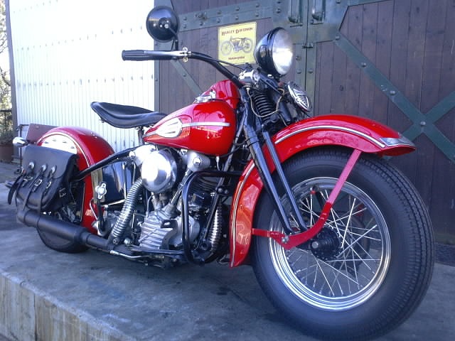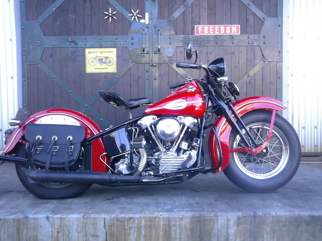 SOLD1946年式の74cu.in.(約1200cc)FL ナックルヘッドです。 1946年モデルは、翌年の1947年モデルより工業デザイナーのブルックス・スティーブンスによる大幅なデザイン変更が施されるので、1941年より続いたデザインの最終モデルとなります。 現車は1946年当時の雰囲気をそのまま醸し出している非常に完成度の高いナックルヘッドです。