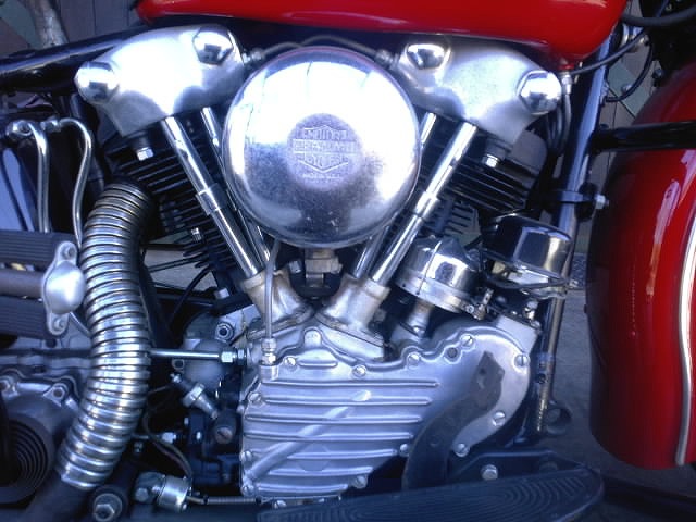 1946年式の74cu.in.(約1200cc)FL ナックルヘッドモーター。 圧縮比は7.0:1。 カムカバーには装飾的な意味合いを持つフィンが付いています。 |