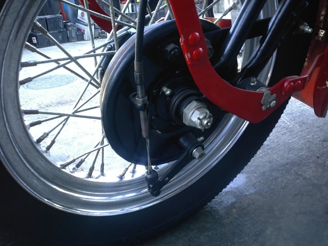フロントドラムブレーキ。 整備&テストを繰り返しているので、必要にして十分な制動力。 タイヤサイズは前後16インチです。 |
