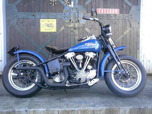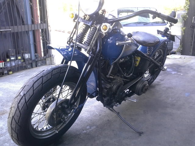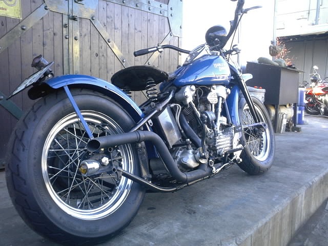 1941年式の74cu.in.(約1200cc)FL ナックルヘッドです。 この年より各パーツは大幅な変更があり、それと同時にエンジンの方もクランクシャフトの大径化、フライホイールテーパー部分の大径化、ロッカーアーム部分の改良などしっかりスープアップされています。 現車は1941年のFLの外装を大幅に変更したレーシーな雰囲気漂うボバースタイルのナックルヘッドです。