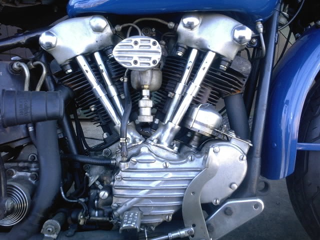 1941年式の74cu.in.(約1200cc)FL ナックルヘッドモーター。 圧縮比は7.0:1。 この年の1941年よりプレーンなカムカバーに装飾的な意味のフィンが付いてメカニカルな雰囲気に。 '41年以降、シリンダーは冷却効果を高めるためにフィンの長さをそれまでの9.5mmから12.5mmへと拡大しています。 |