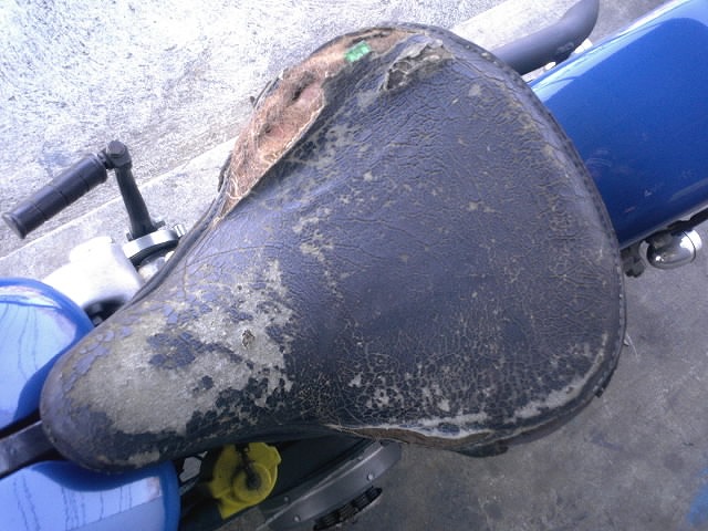 かなり疲れているサドルシート。 がんばればもう少し乗れますが、そろそろ張替えの時期。 シートの支持はセンターポスト方式ではなく2スプリングタイプ。 |