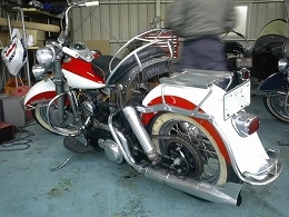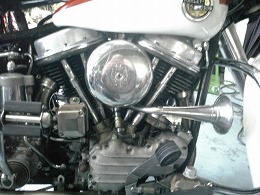 当時の世界最速クラスであった1958年式 FL1200 パンヘッド デュオグライドモーター。 大型のウインドウシールドなどのツーリング装備で100〜110km/hの快適なクルージングができるバイクは当時はデュオグライドとBMWくらいでした。 |