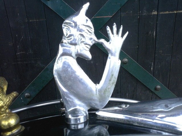 フロントフェンダーに鎮座する通称”デビルマン”と呼ばれるオーナメント。 当時のアクセサリーですが、ツノや指も折れていない完璧なコンディション。 |