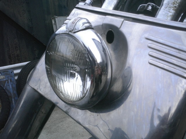 オールドアメリカンのフォグランプなどによく使われているユニティ製のヘッドランプ。 ナセルに少しだけめり込ませるようにマウントし、一体感を出しています。 |