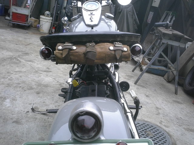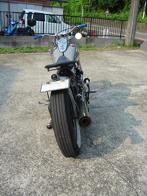 マフラーはシューペリアー製。 エキマニはフリーダムにてワンオフ。 フロントシリンダー付近からリアエンドまで一直線に伸びるシルエットはこのマシンの特徴の一つ。 どこかホットロッドテイストな雰囲気です。 |