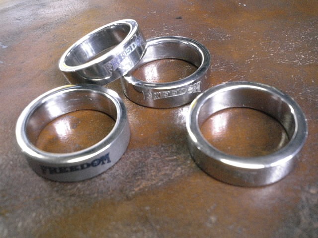 純度99.47%のチタン製フリーダムオリジナルリング。 表面にはフリーダムのロゴが入っています。 ネームタグやツールBOX用キー同様、ポリッシュとソリッドの2種類、ブルーとゴールドの2種類の文字色から選べます。