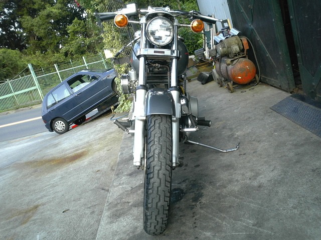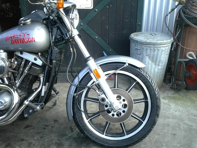 フロント回りの画像。 フロントフォークはアクスルシャフト〜フォークトップまで約80cmで、FXEなどと同じ長さに変更されています。 |