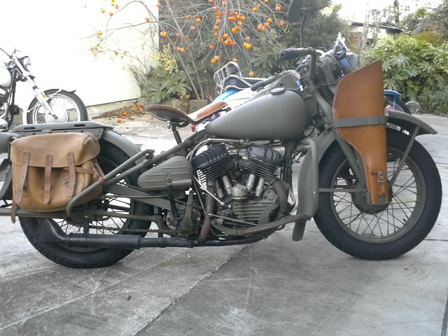 1942年式の貴重な45cu.in.(750cc)WLA サイドバルブ アーミーです。 WLAはWL750の装飾装備を簡素化し、さらに戦場で使われる装備を搭載した第2次世界大戦時に作られた軍用モデルです。 WLAの"A"とはアーミーのことで'39年から作られ、大戦中にはヨーロッパをはじめカナダ(WLC)や中国、ロシア、南アフリカなどにも納入されていました。 ミッションは3速ですがワイドレシオギアなので、高速道路もガンガン走ります。 現車は戦場に支給されないままオーストラリアで木箱の中に眠っていた走行距離数十マイルのほとんど新車状態の1942年式 WLA サイドバルブ アーミーです。