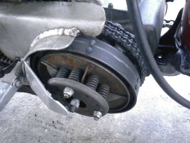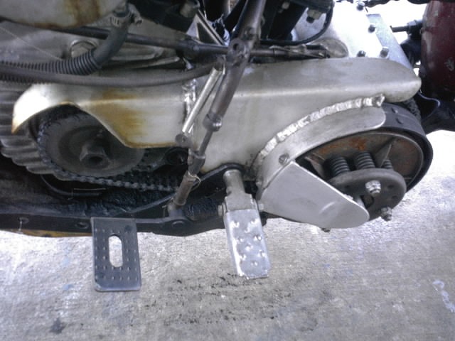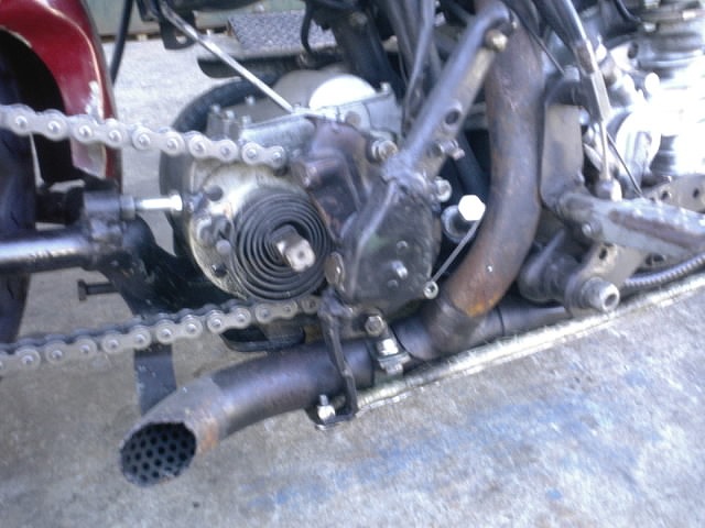 車体左側部分。 小ぶりながらメカメカしい雰囲気があります。 クラッチはハンド/フットクラッチと共用。 レーススタート時にハンドクラッチ、走行時にフットクラッチと使い分けが出来ます。 |