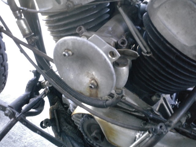 フロントドラムブレーキ。 本来ダートトラックバージョンのためブレーキレスでしたが、SRのフロントブレーキを移植。 旧車レースの世界では一般的な手法です。 |