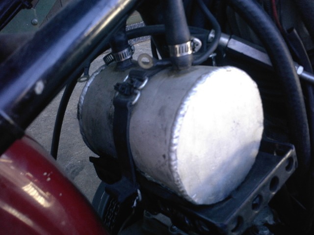 ワンオフのバレル型オイルキャッチタンク。 シート下に収まっている為、あたかもチョッパーのオイルタンクのようです。 |